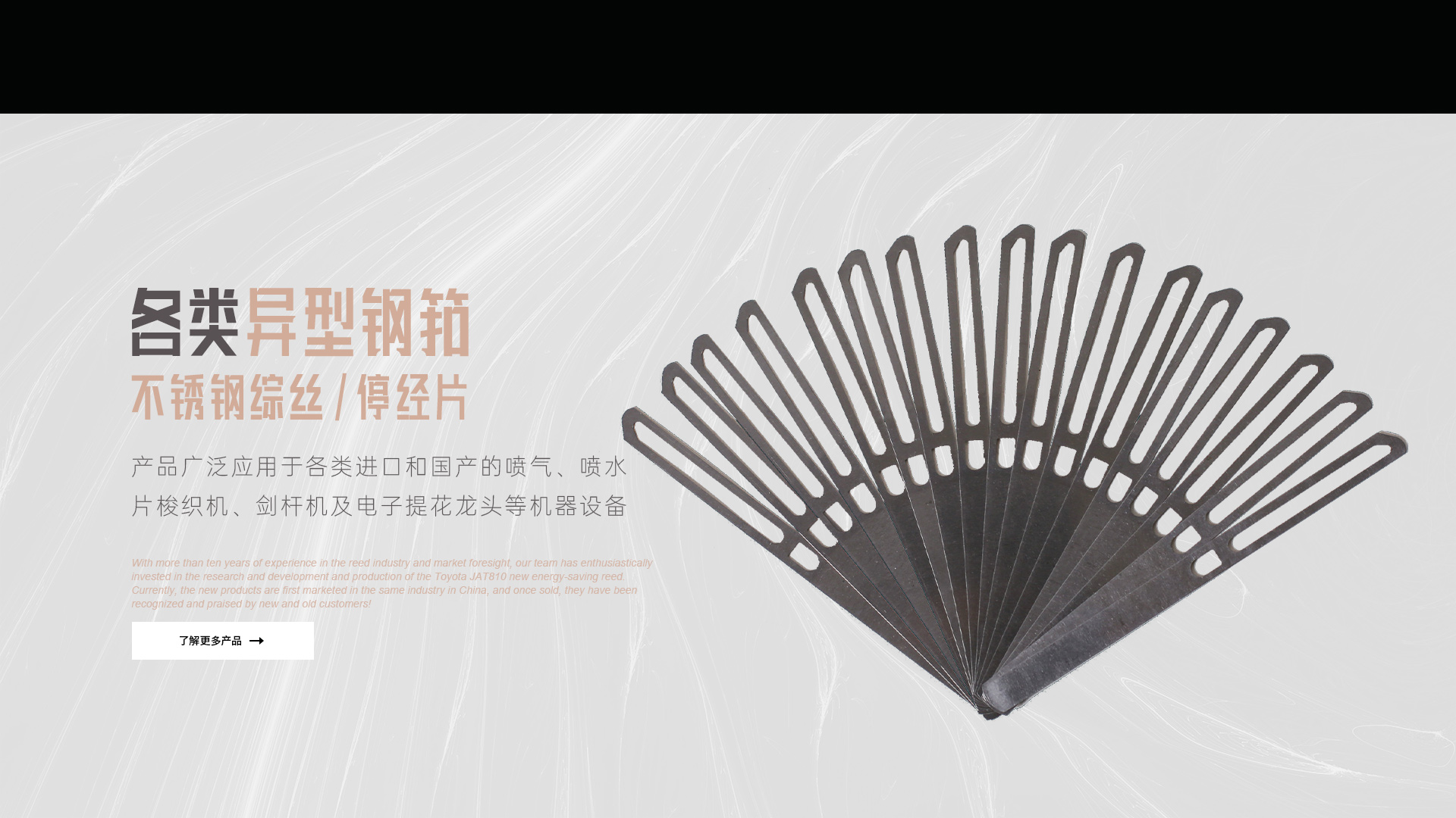 公司主要產品有:噴氣織機用各類異型鋼筘(傳統型豐田JAT710鋼筘及新研發的豐田JAT810節能筘);不銹鋼綜絲及不銹鋼停經片。我們的產品廣泛應用于各類進口和國產的噴氣、噴水、片梭織機、劍桿機及電子提花龍頭等機器設備。